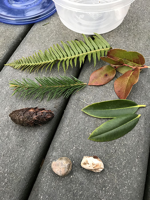 We talked about how pine cones become fir trees, checked out some ferns and salal brush, and looked at a bunch of rocks until we found some interesting ones. One, in particular, looked like a dinosaur tooth. It took a grand total of fifteen minutes to scope out a few items in Mother Nature’s treasure chest, just the right amount of time for a four and a half year old’s attention span.
