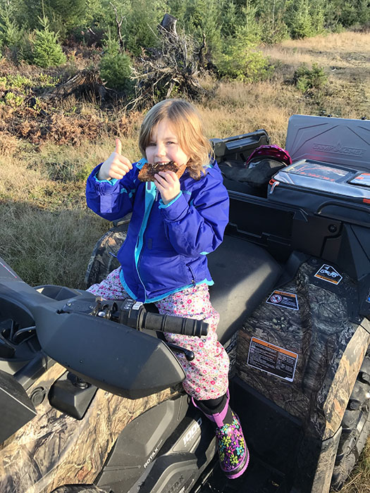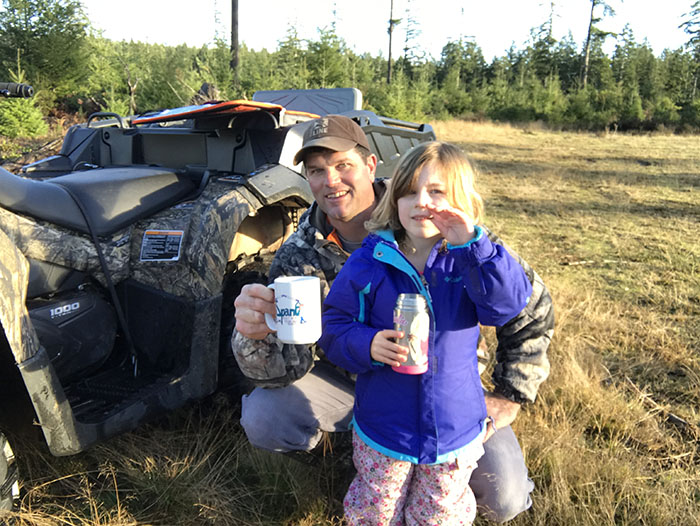The mission at hand was to teach her five things about the outdoors – pine cones, fir trees, ferns, salal, and some interesting rocks. The bridge between adventure and learning would be a fun ride on this beast-of-a-machine Outlander 6 x 6 along with grilled cheese sandwiches and hot cider off our new Camp Chef Rainier Campers Combo stove.