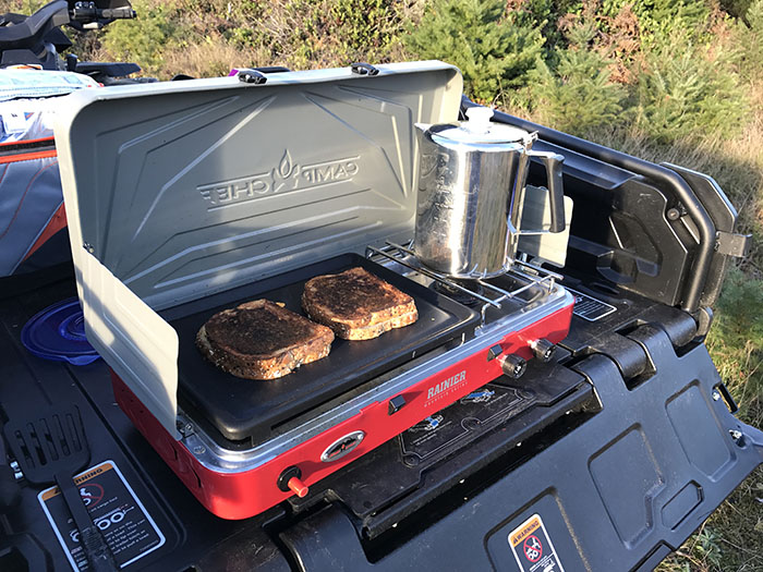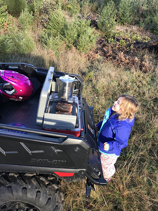 Ava’s no stranger to this stove. We use it quite a bit at home for “camping” on our back deck and it now resides permanently in my river sled. Packing it along in this ATV was a no-brainer!