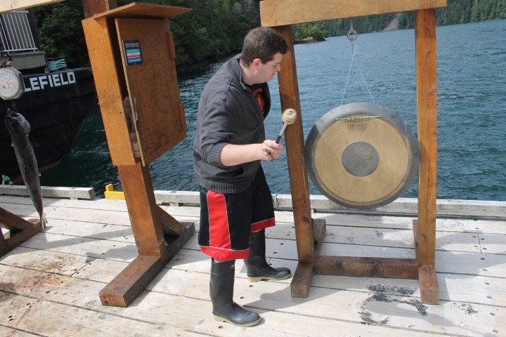 The tradition at Englefield Bay is that the angler who lands a tyee gets to sound the gong and Matt has no problem making a little noise over his first Haida Gwaii tyee!