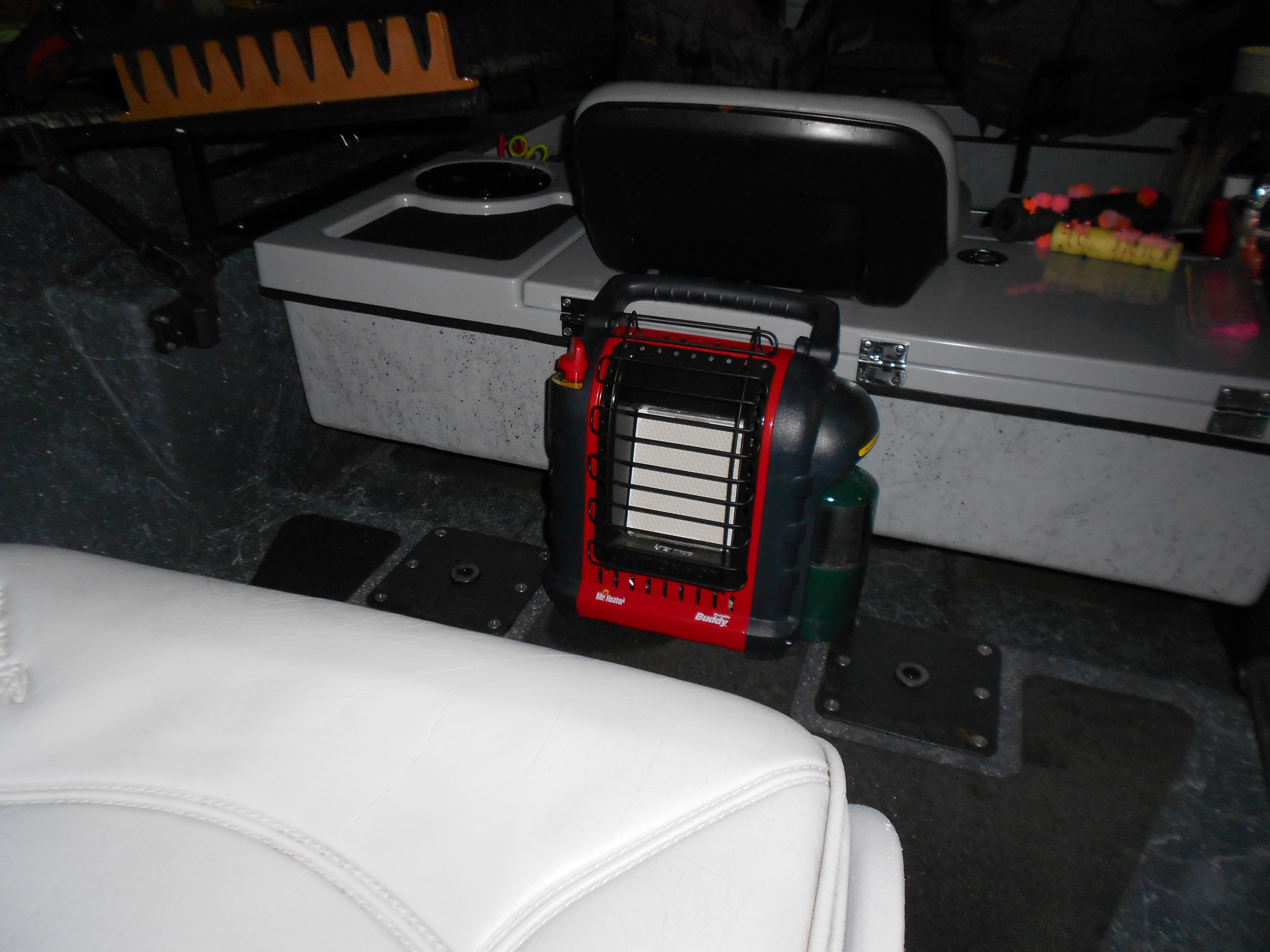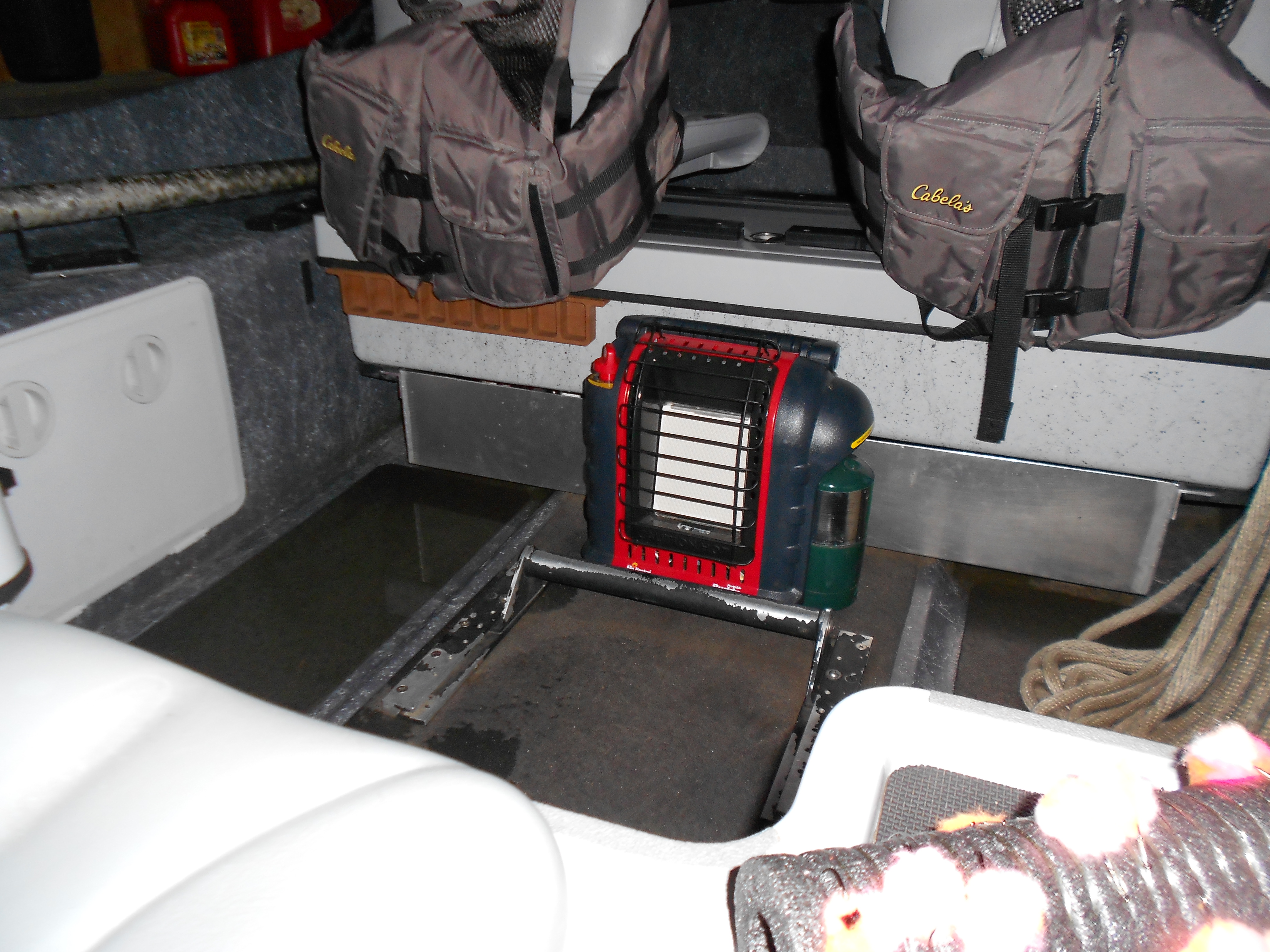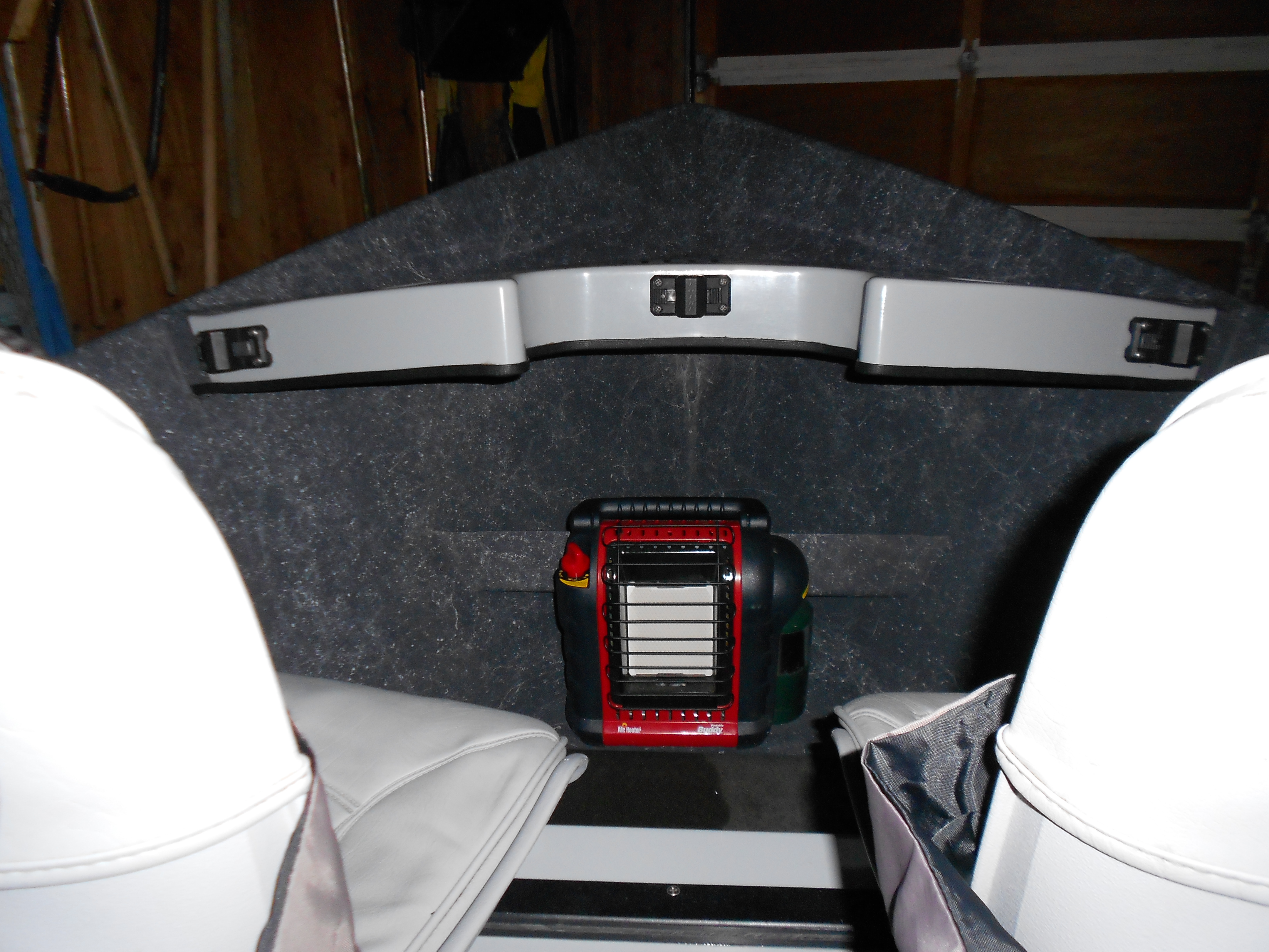 Finally, the view form the rear seat, I think you get the idea. The bottom line is, these things are compact, portable and crank out the heat. With three of them in the boat, every seat gets the heat. When the day finally warms up they are compact enough to tuck away in the back of the boat, and well out of the way.