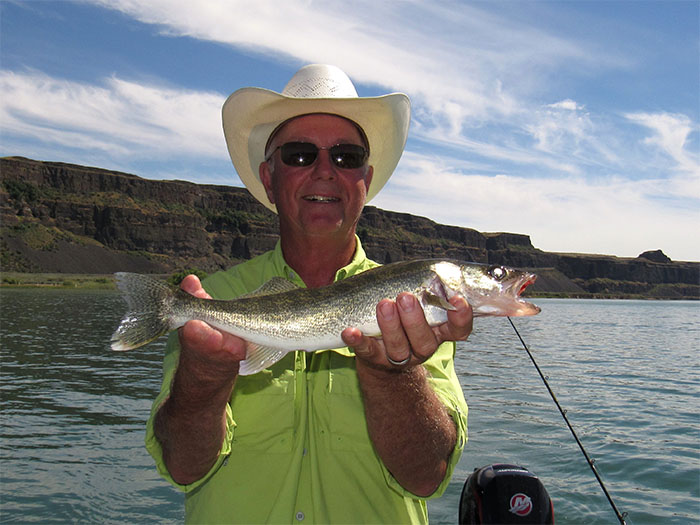 Lar Larson holds up one of the walleye he caught while trolling crank baits with me on Banks Lake.