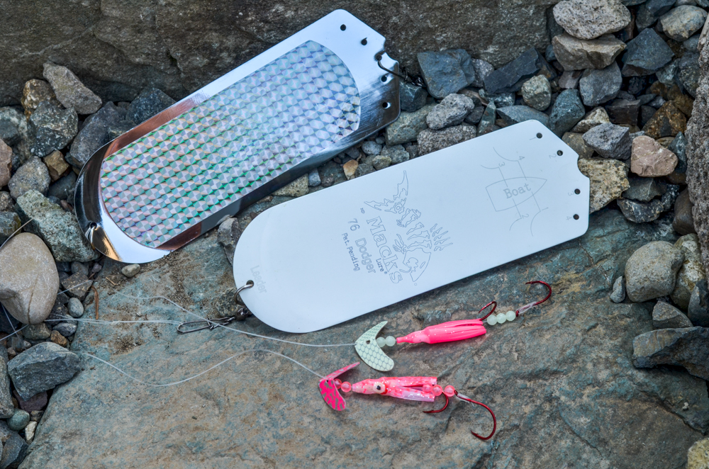 Dodgers and lures need to be “teamed up” for the day’s fishing. The Double D dodger by Mack’s lure along with a Cha Cha mini-squid is a top Kokanee set-up. When using the 9 inch dodger shorten the leader to 8-12 inches to impart some whipping action on the fly or squid behind it. For the smaller 4 inch dodgers I like to pair them up with a Double Whammy wedding ring spinner and a longer leader of 24 inches. Both of these set-ups are designed to be used at slow speed, around 1 mph, which is about perfect for early season Kokanee fishing. Later in the year kick up your speeds to 1.5 mph and switch to a Sling Blade style dodger.