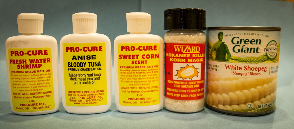 Corn is a must! White Shoepeg corn for some reason is an absolute must for Kokanee fishing. Corn naturally has a lot of oil in it and attracts Kokanee. To increase your bites substantially though soak your corn overnight in Pro-Cure bait oils along with some Wizard Kokanee Killer Korn Magic which toughens the corn and adds bite stimulates.