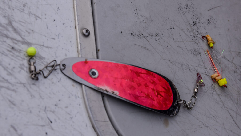 Starting with a base of shoepeg corn and then mixed with a variety of Pro-Cure scents. Jeff makes his own baits, often having multiple “flavors” on board, but a go-to scent is Bloody Tuna. Anise, krill, and sweet corn are proven kokanee scents as well. Pro-Cures Bait Sauce is very sticky and is perfect for smearing on the dodger to create a large scent column to attract fish. Jeff mentioned that he prefers shoepeg corn mostly because the kernels are longer and easier to put on the hooks, two pieces of corn on each hook, every time.