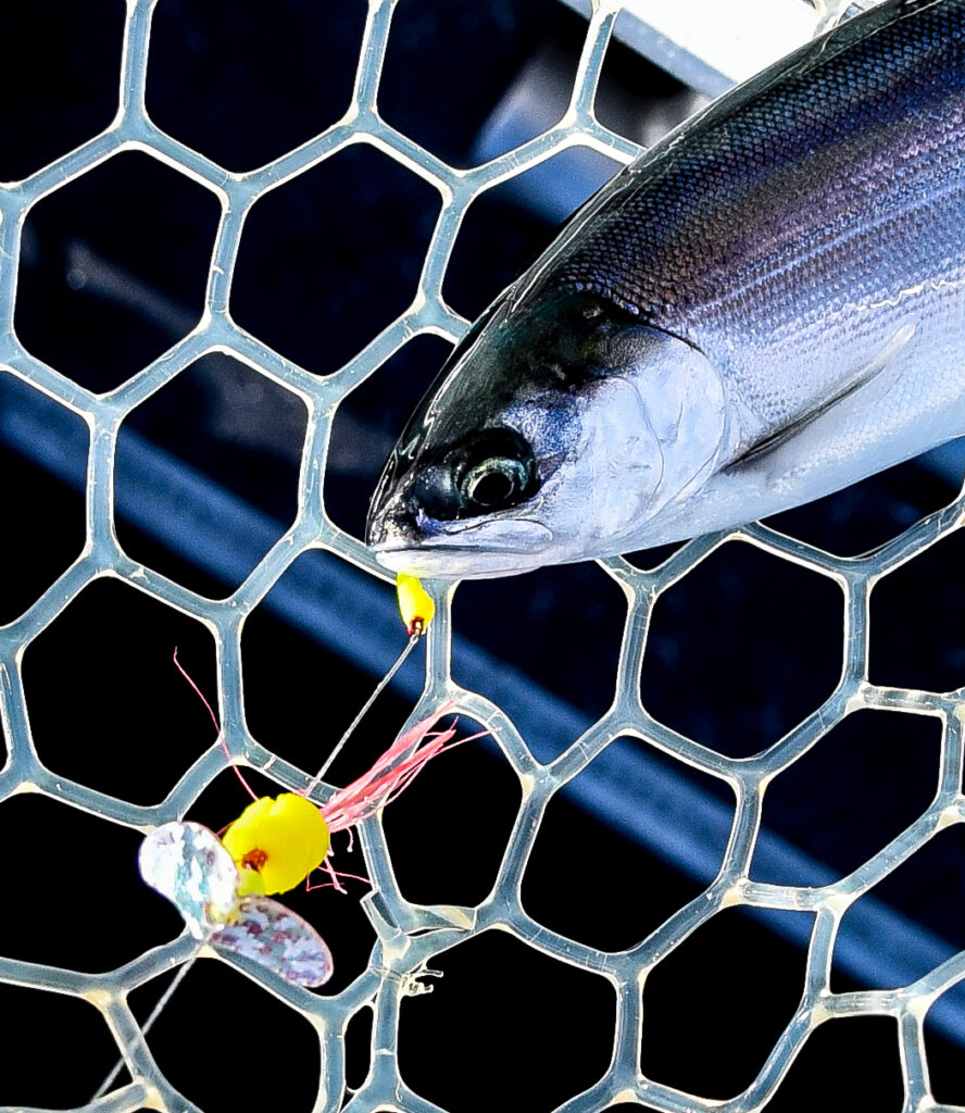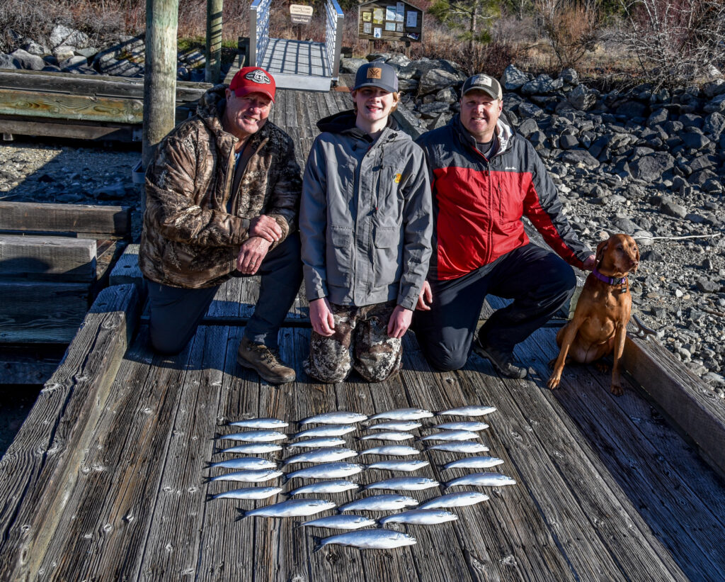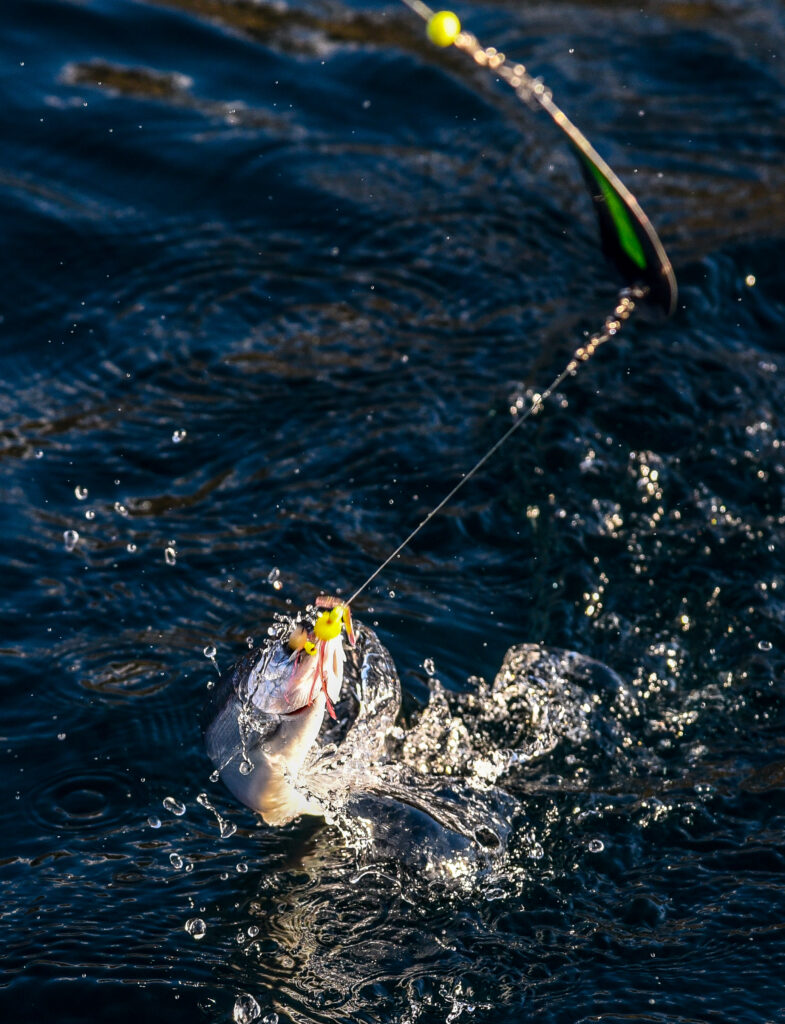 Depth can vary depending on sunlight, water temperature or thermocline, food, which in this case is plankton, and over-all depth of water. To prove this point, we switched from the north shore to the south shore of the lake and as soon as we hit the 400-foot line again we started getting bites. Jeff mentioned somedays the fish are in 300 feet of water, other days in 600 feet of water and this day it was 400 feet. He usually fishes 100 feet down during the winter months as this is the thermocline but is always looking at the sonar looking for schools of fish and will adjust to the depth where they are located.
