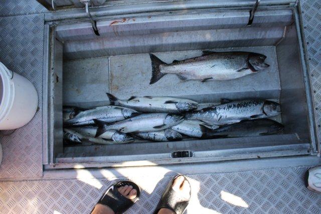 We had a very productive morning and the in the fishbox was a mixed bag of chinook, hatchery coho and, yes,,, pink salmon!