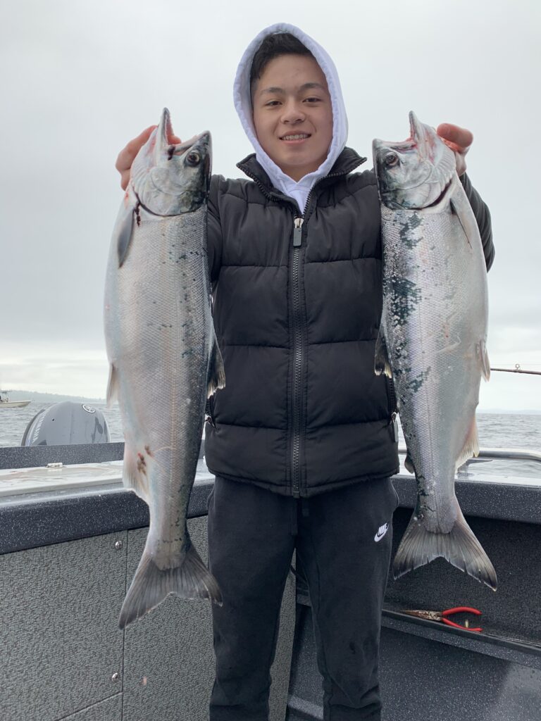 Salmon anglers can start making plans to hit central Puget Sound for resident coho when it opens on June 1. This nice pair of coho were caught off the shipping lanes near Jefferson Head in 2019 by Tegan Yuasa.