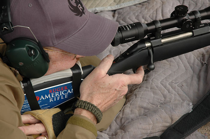 At the bench with a lightweight rifle, I make sure the front rest contacts the forend adequately. On a hard rest, a slim, rounded forend has essentially single-point contact. I prefer a soft rest that better limits bounce. A bit of side support helps steady the rifle. Often I pull the front of the forend down into the rest while aiming. I also use a toe rest. My trigger hand grasps the rifle firmly, tugging it into my shoulder and against my cheek. Without firm support front, rear and center, a lightweight rifle will almost surely move as you press the trigger. To deliver tight groups, all rifles must be held the same way each shot, no matter your shooting style. A lightweight rifle is more sensitive to slight changes in technique.