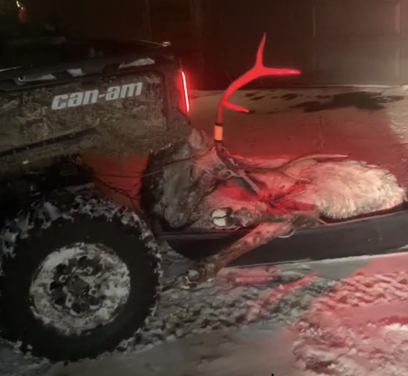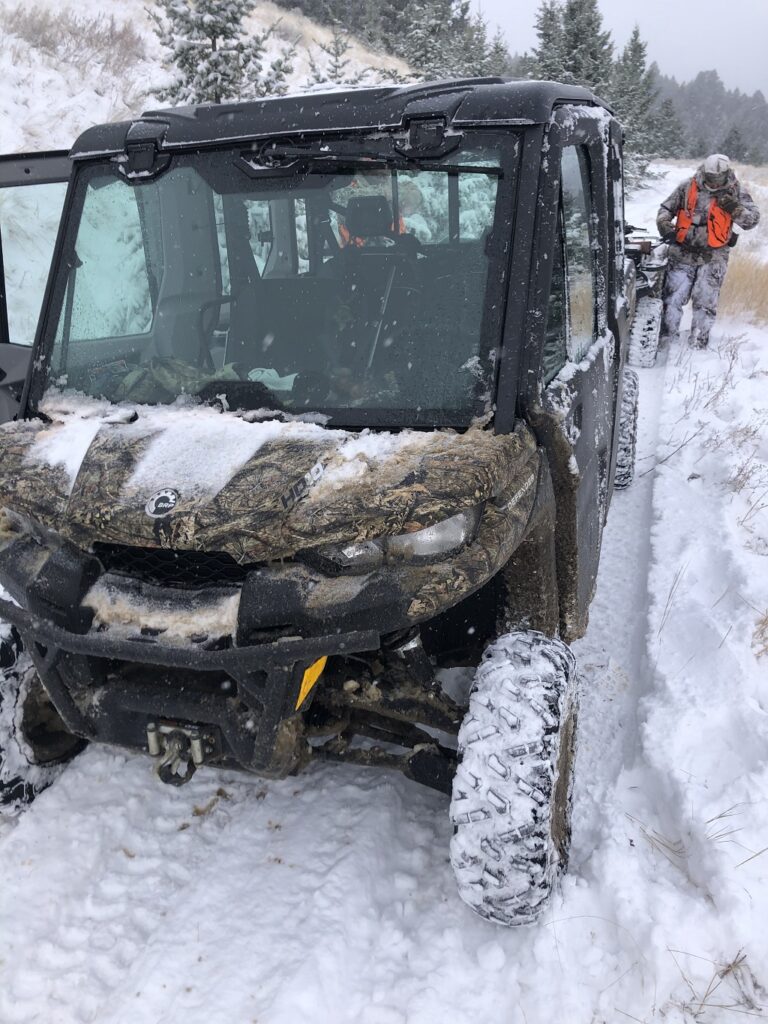 The snowy, steep terrain was no problem for the Can-Am Defender ATV as we were able to use this mobility and the front mounted winch to get this bull elk up and out whole which is a huge accomplishment and a comfort with darkness and another blizzard bearing down upon us!
