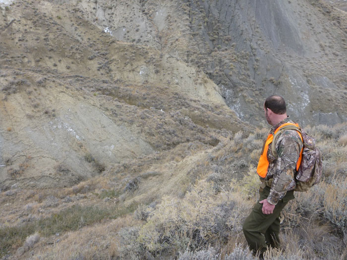 Here’s a little better view of the ravine Jim was shooting across. The mule deer was standing at the top of the dark patch that looks like “Z” on the right side of the ravine. This is a chip shot for a .300 WSM!