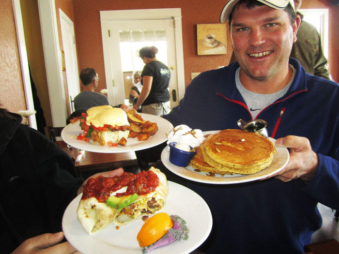 It wasn’t long after we ordered before the kitchen door flew open and hot plates began to hit the table. Our outdoorsy and fit waitress presented us with Smith Rock Benny, pumpkin pancakes, Joe’s Special scramble, and a breakfast burrito before hustling off to keep up with the orders. How these waitresses stay in such great shape with all this awesome food around is beyond me. I was sitting with two ladies that also eat like birds and my food coma dreams were about to come true.