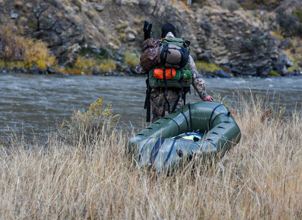 The time finally came to go on our hunt. Jeff picked me up in the early morning hours and it wasn’t until we actually pulled into the pullout along the river that I finally got to see this raft. Jeff had rented it from Matt Harrington, owner of Backcountry Packraft Rentals (406-272-6468), a Montana company that will mail you the raft for your use for a very reasonable fee and when you are done with your hunt you simply mail it back to them. Pulling it from a duffle bag and hooking up the air compressor to the trucks power outlet it was soon inflated and I realized it was “self-bailing” meaning it has holes on the bottom to allow water to drain out of the raft. This is great when running whitewater but not so great when I didn’t have waders. Luckily I packed a dry bag with an extra set of clothes. Crossing the river with our gear first and then coming back to pick up Jeff made it easy. The raft was small but very sturdy and had no problem holding the weight of the gear and guys.