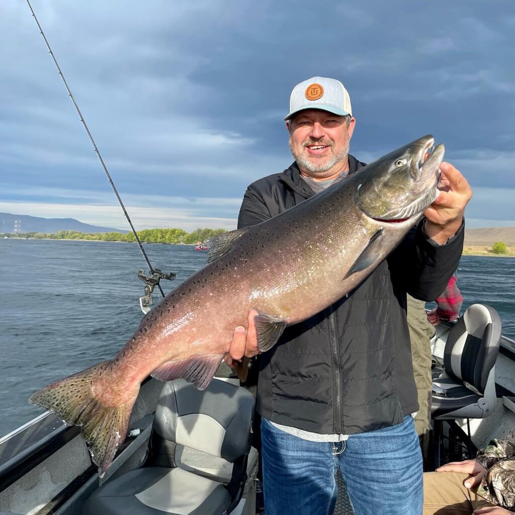 A client of Aaron Peterson, owner of Peterson’s Northwest Guide, shows off a nice fall chinook caught in the Hanford Reach area of the Upper Columbia River earlier this week. Photo courtesy of Aaron Peterson.