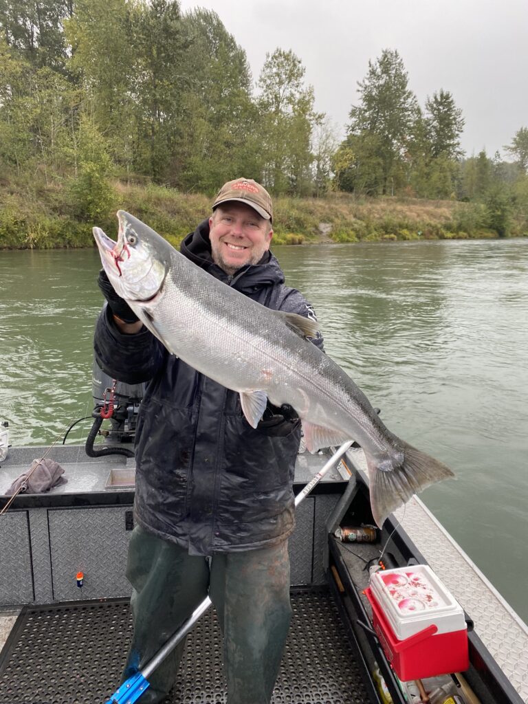 Guide Todd Daniels, owner of Tall Tails Guide Service, holds up a big hatchery coho caught in the Cowlitz River earlier this week. Photo courtesy of Todd Daniels.