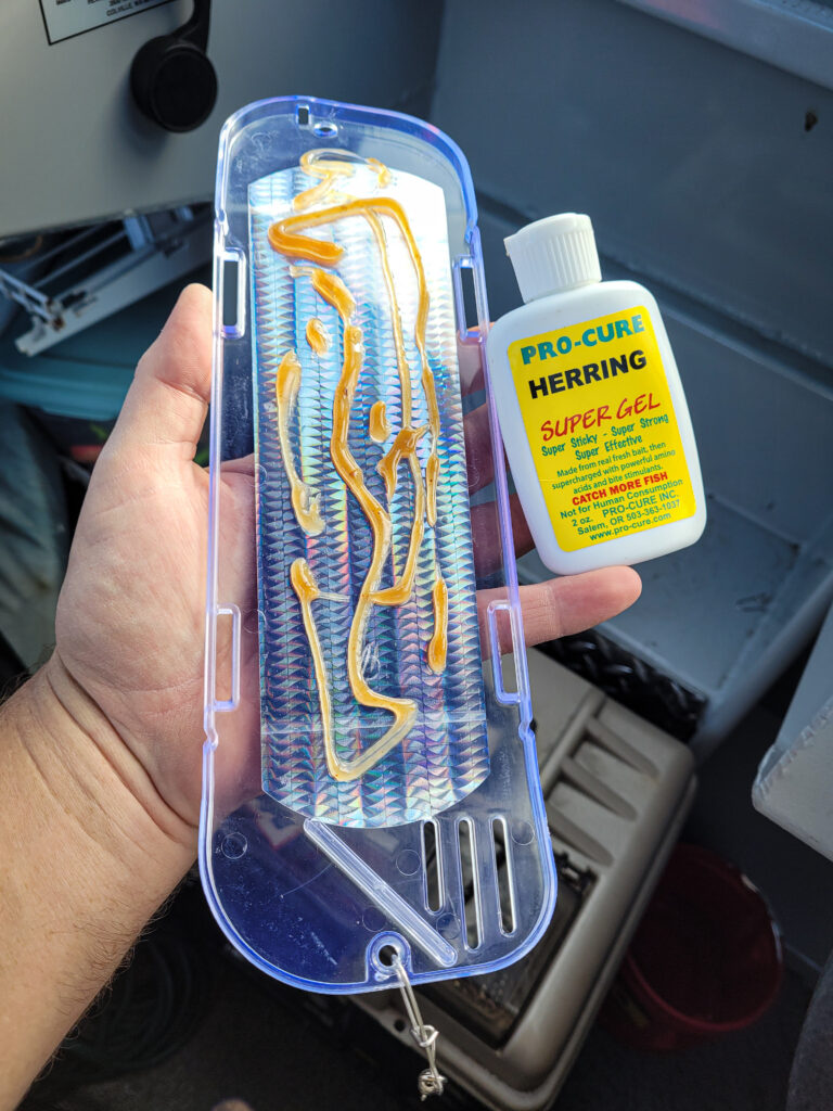 When we trolled along the shore, we noted that a lot of baitfish were jumping in the kelp. It is impossible to troll in the actual kelp itself but by trolling just outside of the kelp we picked up several fish. This is how we caught most of our coho which were inside the kelp and saw our flashers which enticed them to see what was going on and then bit our lures. Every fish we kept we made sure to check what they were eating and all of them had juvenile baitfish, about 2 inches long. It is really hard to cut plug a 2-inch herring so we used artificial lures, mostly small spoons such as Coho Killers and Coyote Spoons in the sardine pattern but also the Brad’s mini-cut plugs, and Yakima Bait SpinFish, all doused heavily with Pro-Cure Super Gel in anchovy or herring. We did have a UV blue spatter (Silver Horde Gold Star 8144 OG144R) squid skirt (hoochie) trailing behind a Macks Lure Scentflash UV paddle flasher that produced two of our three biggest fish but the smaller presentations were bit more often.