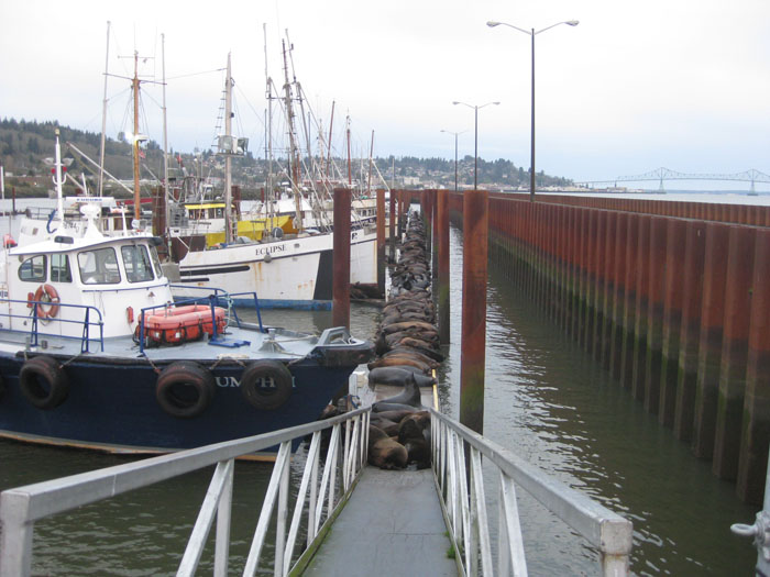 On the heels of a record smelt run in the Columbia River there’s a new record, of sorts, being set by California Sea Lions on the lower Columbia River. Yesterday there was an astonishing 1420 sea lions hauled out on the floats of the East Mooring Basin in Astoria, Oregon. It’s the highest number of the furry pinniped’s ever encountered in the marina and biologists, as well as anglers, are hopeful the sea lions are heading downstream instead of upstream.