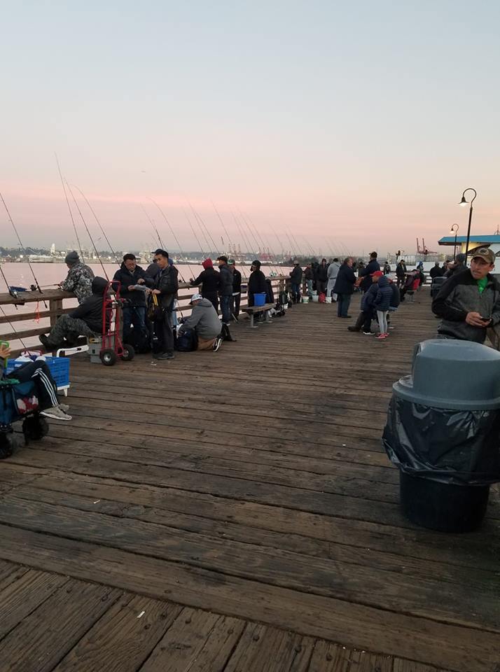 Squid jiggers at the Seacrest Pier in West Seattle try their luck. Photo courtesy of Doug Hanada.