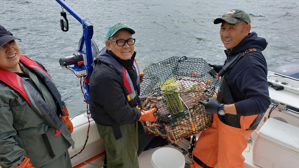 Paul Kim (right) of Bellevue and family friends with a nice haul of spot shrimp on opening day.