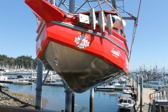 After the fishing was done, it was a race to the sling! Big Red shows off her reverse-chine, chambered design which is the reason she is a chop cutter, not a back buster,,,