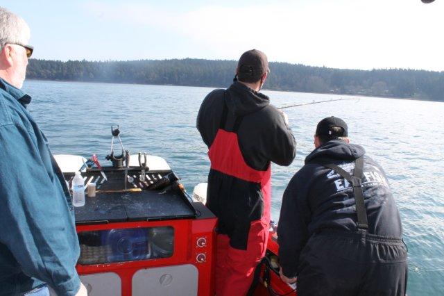 After the show, we hustled out to the north end of Orcas Island and it wasn’t long until Robbo was into a nice fish! Here, Larry Carpenter and Duane clear the gear for the “Gringo Grande”.