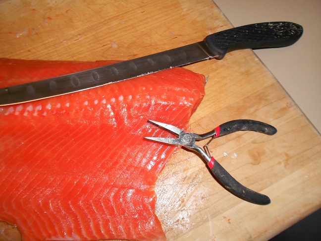 I think it is important to serve any fish, cooked as a chip, absolutely boneless. This takes a little time but is well worth the effort. After you have your salmon fillets, you need to take the time to remove the pin-bones. A small pair of flat-nose or needle-nose pliers work well.If you are not sure exactly how to remove the pin-bones, here is a helpful quick video. “Remove Pin Bones” Next you’ll want to remove the skin off the back side of the fillet and be sure to remove the excess brown fatty meat.