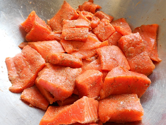 My choice of seasonings are pretty simple, Pepper, Garlic Salt and “Tony Chachere’s original Creole Seasoning”. If I want to make my Salmon Chips with a little extra bite, I’ll also add Tony’s Cajun seasoning as well. Season your chunks of fish generously, as you want the flavor to wake up your taste-buds…