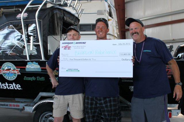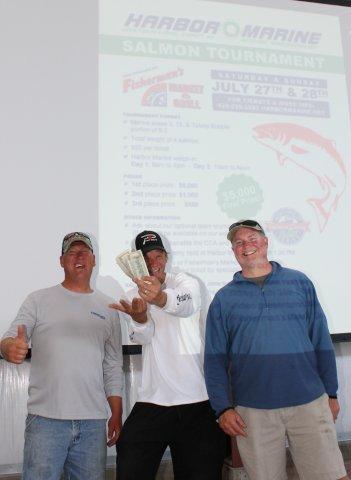 Team Outdoor Line, left to right Walt Hylback, Brandon Robichaux and yours truly hoist the grand prize $5000 check and more importantly, the title of 2013 Harbor Marine Salmon Tournament Champs! Brandon’s two-day, four fish bag came in at 57.4 pounds.