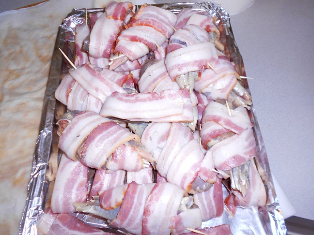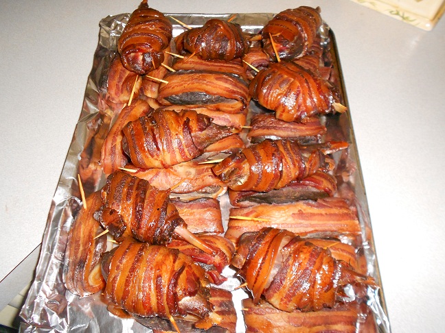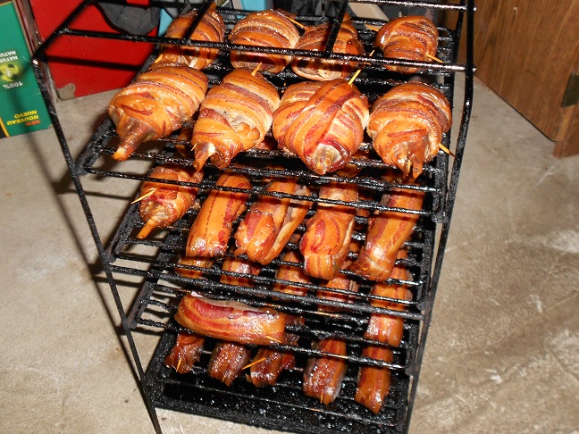 A good look at what the bacon wrapped pieces look like right out of the smoker. Again, the bacon is done but not burned.