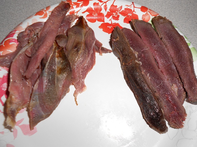 Finally I simply unwrap the bacon and prepare the meat for serving. With the duck, I like to cut it into strips. You can see how the meat ends up medium rare and moist. You will not believe the amount of smoke flavor on this fowl, it’s amazing. For the goose thighs, I strip as much meat off the bone as I can. You will find that the goose tends to be just a bit tougher then the duck, however it’s still very flavorful.