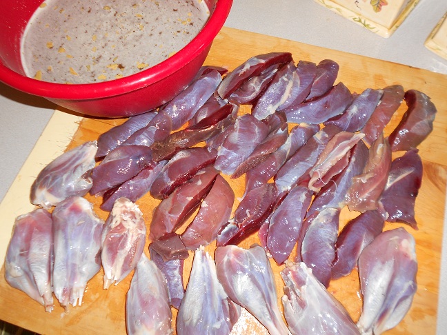 This time I am actually going to smoke duck breasts and goose thighs. For the breast prior to brining I cut them in half length wise. For larger breasts such as big mallards I will even cut those into three pieces.