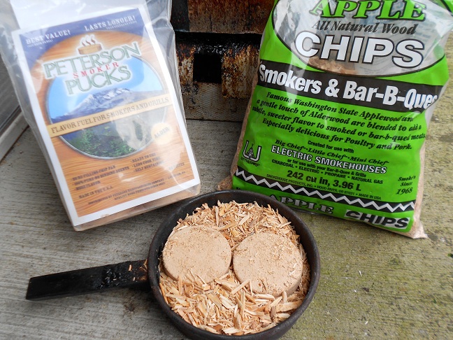 I like to use the Peterson Smoke Pucks, as they really aid in getting the smoker to the higher temps that I need. I also use smoking chips for flavor. When smoking fish or fowl fruit chips are always a great choice. For this recipe I use apple chips as it complements the apple cider brine very nicely.