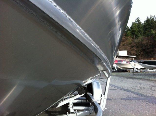 Note the pronounced reverse chine design. Hulls without this vital feature will pound in a head sea and roll noticably in turns. Reverse chines provide a combination of lift and suction that stabilize the boats ride, resulting in a more comfortable and safe experience aboard.